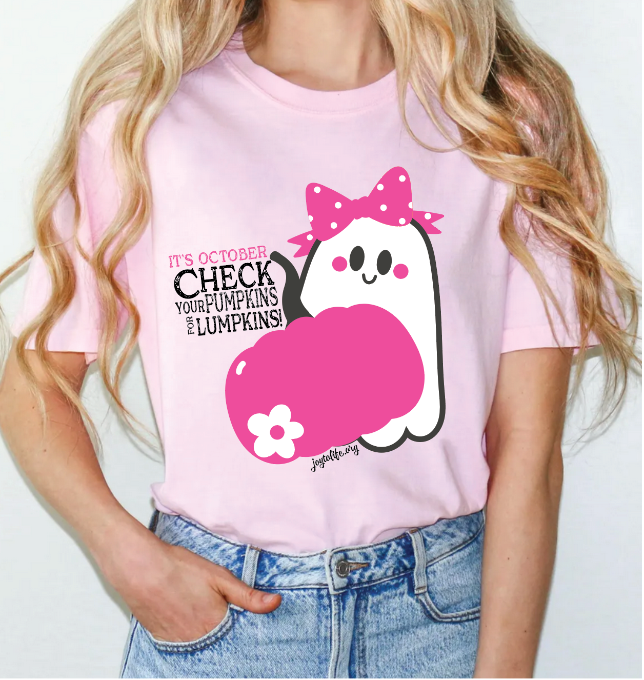 It's FALL Y'ALL! And we've got a new tee that's oh so cute. Our sweet girly ghost and her pink pumpkin wants to remind all of us to Check Your Pumpkins For Lumpkins! It's a new favorite soft pink tee that is getting lots of attention. Available in several sizes, however, we have limited quantities. So buy quick and let's spread the news to help save lives in October!