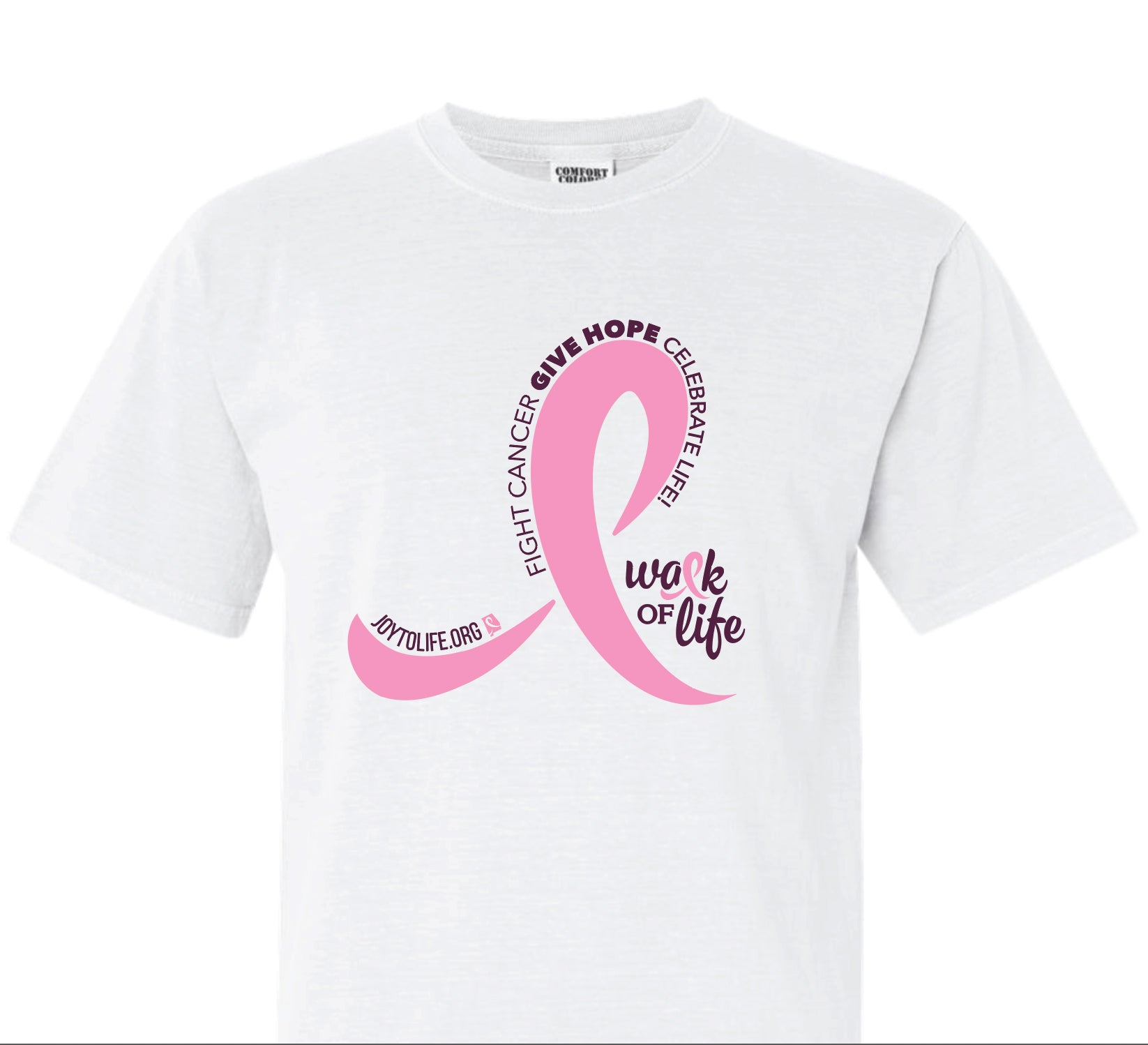 Our 2025 Walk of Life t-shirt is available in white & pepper. Each color has a custom design - a circle design on the pepper color and a ribbon design on the white. For survivors, the white shirt with the ribbon design will have the word survivor on the sleeve.